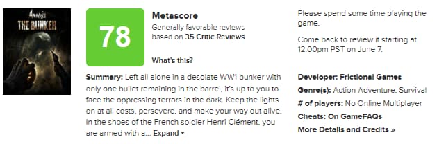 Quel est le score métacritique pour Amnesia: The Bunker ?