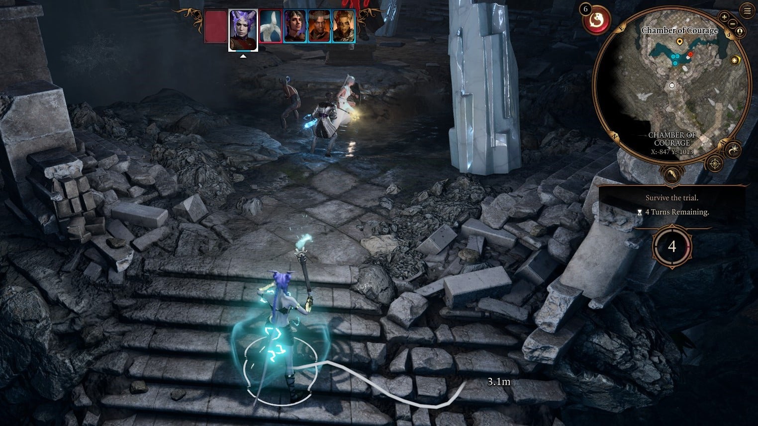 Maintenant, voici le moyen le plus simple de gérer ce combat. Tout d’abord, assurez-vous que c’est un utilisateur d’arme à longue portée qui tient le flambeau. Vous pouvez le faire en les faisant interagir avec la statue de Balduran avant le début du combat. Ensuite, placez-les loin des trois autres personnages, que vous voudrez au milieu de l’arène. Ces trois personnages sont là pour dessiner aggro et ont la meilleure position possible pour tuer tous les ennemis.