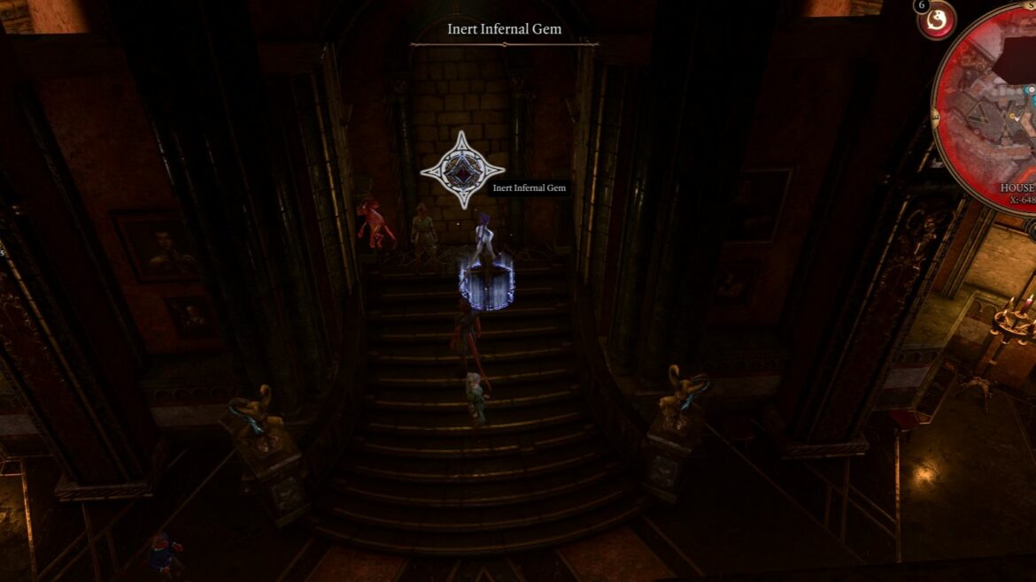 Une fois arrivé dans la Maison de l’espoir, vous aurez accès à une pièce principale circulaire. Mais au centre se trouve la salle de fête. Et derrière la salle de fête se trouve un mur avec une gemme inerte infernale. Passez un contrôle de perception sur ce mur et vous pourrez interagir avec ce joyau.