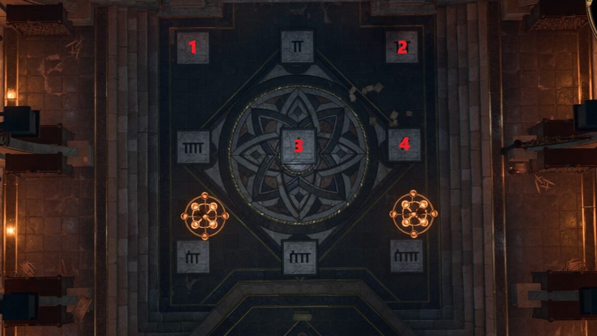 Avez-vous remarqué que l’acte 3 a beaucoup d’énigmes qui vous obligent à courir vers des endroits secondaires? C’est un peu le cas pour la porte de la voûte de la maison de comptage, qui a neuf panneaux sur le sol et vous oblige à marcher dessus dans le bon ordre.