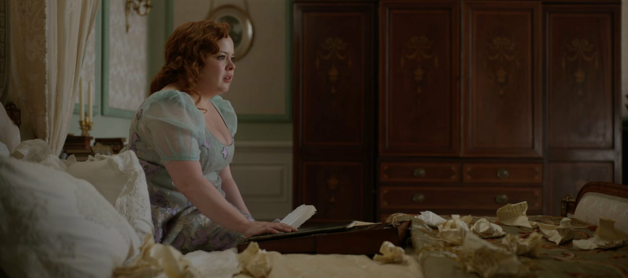 Et son désespoir pue. Elle le mérite, soyons honnêtes. Cressida demande même à Eloise de l’aider à écrire un numéro, mais finalement, cela met fin à leur amitié car Cressida accuse Eloise d’être envieuse. Et quand elle lit le début de son premier numéro à sa mère, Lady Cowper, qui n’est que de quelques phrases, cela devient soudainement une situation de « f**k around and find ». Elle n’a pas pris en compte les circonstances de la révélation qu’elle est Lady Whistledown.