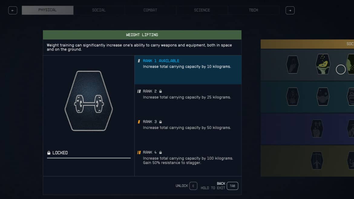 Chaque compétence dans Starfield a un petit défi qui lui est attaché avant que vous puissiez la classer à nouveau. L’haltérophilie vous oblige à marcher un certain nombre de mètres avec au moins 75% de votre capacité de masse actuelle occupée, ce qui est assez facile à faire. Prenez simplement quelques objets dans votre soute et commencez à marcher autour de n’importe quelle planète jusqu’à ce que vous receviez une notification indiquant que le défi est terminé.