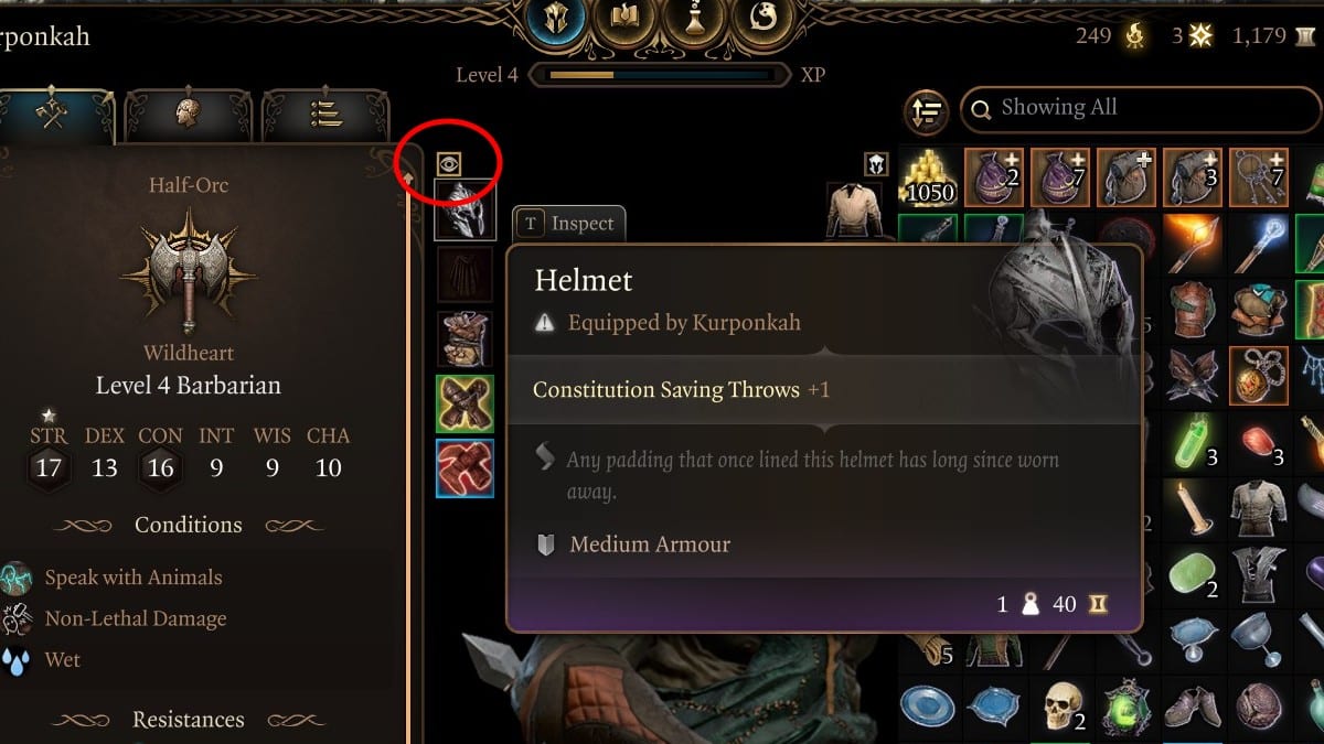 Dans Baldur’s Gate 3, vous pouvez masquer le casque de chaque personnage via le menu de l’équipement en cliquant sur la petite icône en forme d’œil au-dessus de la fente de barre. Pendant le jeu, appuyez sur Tab pour ouvrir le menu d’équipement de votre groupe, ou appuyez sur I pour ouvrir le menu d’équipement d’un personnage sélectionné.