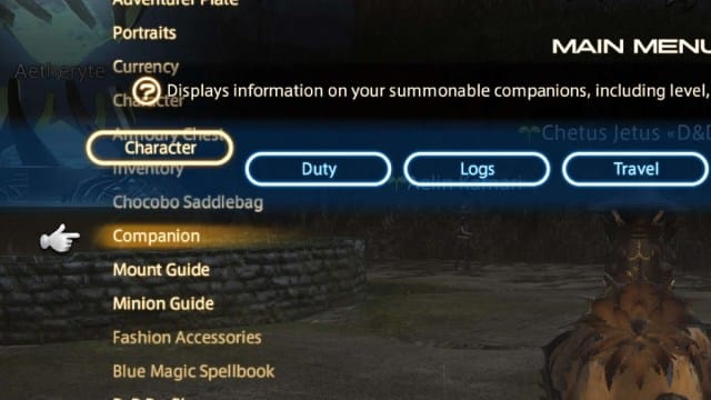 Une fois que vous avez déverrouillé le nouveau Chocobo Barding et l’avez ouvert dans votre inventaire, vous vous demandez peut-être pourquoi votre Chocobo ne porte pas sa nouvelle tenue. C’est une solution facile et ne nécessitera que quelques instants de votre temps. Affichez l’écran de votre menu principal et accédez à l’icône Compagnon sous Caractère. Cela fera apparaître votre menu Chocobo d’entreprise, qui a quelques options différentes à votre disposition.