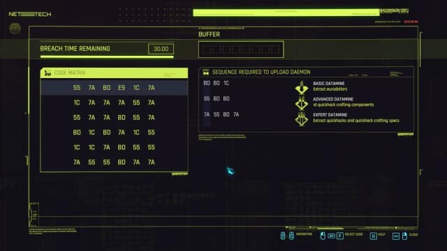 Lorsque vous démarrez le mini-jeu Breach Protocol, vous verrez la minuterie en haut à gauche. Le minuteur ne démarrera pas tant que vous n’aurez pas sélectionné votre premier caractère dans le Matrice de code. Sous Matrice de code se trouvent des caractères disponibles que vous pouvez utiliser. Cependant, il existe une séquence dans laquelle vous pouvez choisir les personnages.