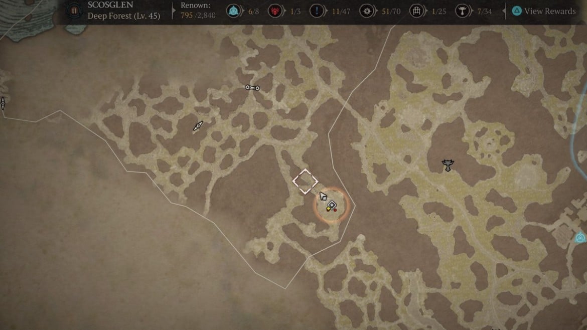 j’ai trouvé Souffle d’ange fraye dans le Région de la forêt profonde de Scosglen, jusqu’à la pointe sud de la frontière. Cette zone a le potentiel de générer un événement mondial, mais sur le chemin exigu qui y mène, j’ai trouvé des Angelbreath à cultiver. Vous pouvez voir sur la carte ci-dessous où se situe le spawn autour du carré blanc. L’événement mondial que j’ai rencontré est juste au sud de la ponte.