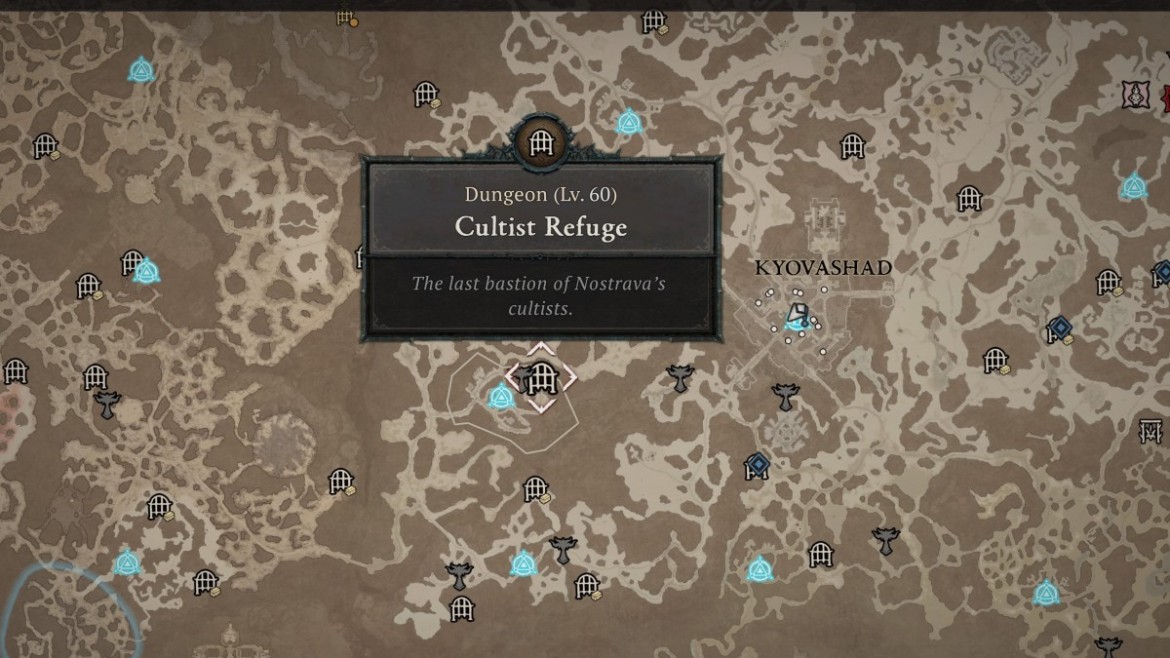 Le Cultist Refuge est situé dans la section Nostrava des pics fracturés dans Diablo 4. Vous pouvez le trouver au sommet de Nostrava dans la cathédrale, et l’entrée ressemble à n’importe quelle cave que vous trouverez autour du sanctuaire. Cependant, le donjon ne sera pas accessible par défaut.