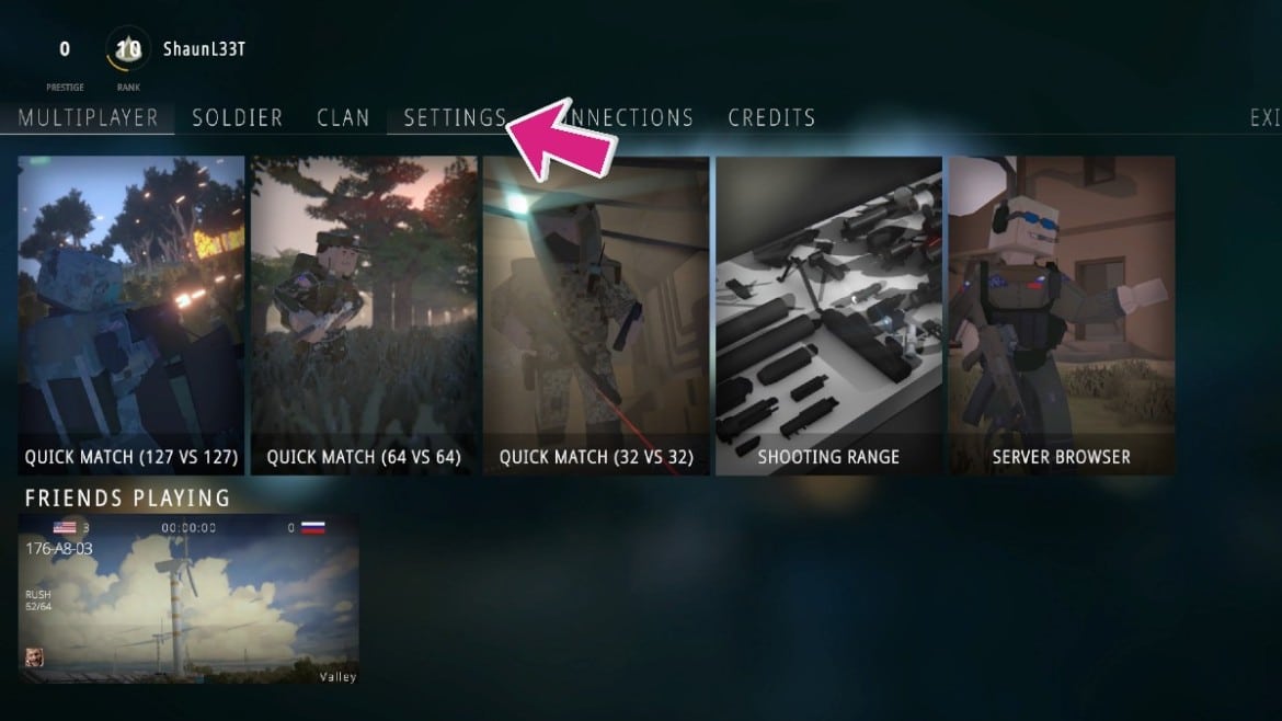 Lorsque vous démarrez BattleBit remasterisévous vous retrouverez sur la page de démarrage, où vous aurez la possibilité de vous joindre à un jeu rapide de votre choix ou de jouer avec certains des différents paramètres disponibles. Vous aurez envie d’aller directement dans le Menu Paramètres.