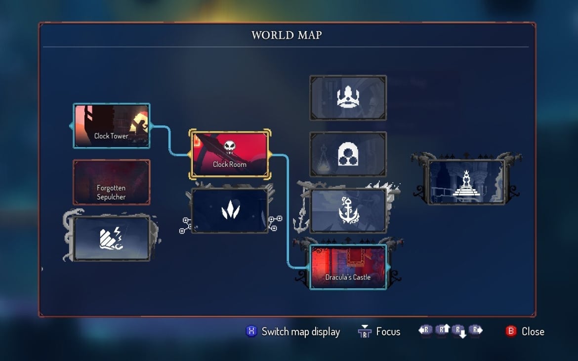 Donc, pour progresser dans Return to Castlevania, vous devez résister à l’envie de descendre ces escaliers et de commencer une course normale ailleurs. Rendez-vous au biome du village sur pilotis, puis à la tour de l’horloge après cela. Après avoir vaincu le Boss dans la salle de l’horloge (je déteste ce type), vous pourrez entrer dans le vrai château de Dracula. Contrairement à la version précédente, il s’agit d’un biome beaucoup plus difficile avec beaucoup plus d’ennemis. Dracula est là aussi, et il sort pour vous déranger de différentes manières pendant que vous essayez de vous occuper de tout le reste.