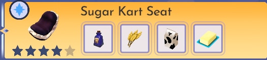 Placez les ingrédients dans une marmite et émerveillez-vous devant le délicieux Sugar Kart Seat que vous avez préparé. Vous pouvez cultiver vous-même le blé et acheter le lait et le beurre à Remy.