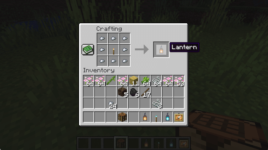 Avec la lanterne, vous aurez besoin d’une torche et de morceaux de fer. Mais vous n’utiliserez pas ces barres de fer. Il est utile d’avoir un bon stock de fer avant de plonger dans votre côté créatif pour l’esthétique, mais cela aide que les lanternes nécessitent des pépites de fer plutôt que des barres pleines. Tout comme pour créer un coffre, vous devrez créer un cercle entier lors de la fabrication d’une lanterne. Pour cela, vous allez avoir besoin de votre table Handy-Dandy Crafting. Avec les pépites de fer en place, vous placerez une torche au milieu, et le tour est joué ! Une lanterne !