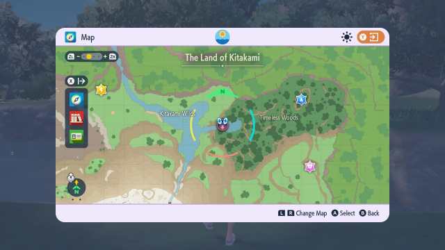 Pour trouver un Basculin à rayures blanches dans Pokémon Écarlate et Violet, vous devrez vous diriger vers les Bois Intemporels. C’est logique, car c’est l’emplacement d’un autre Pokémon Hisuian rare. Une fois dans les bois, cherchez le petit étang alimenté par la rivière Kitakami.