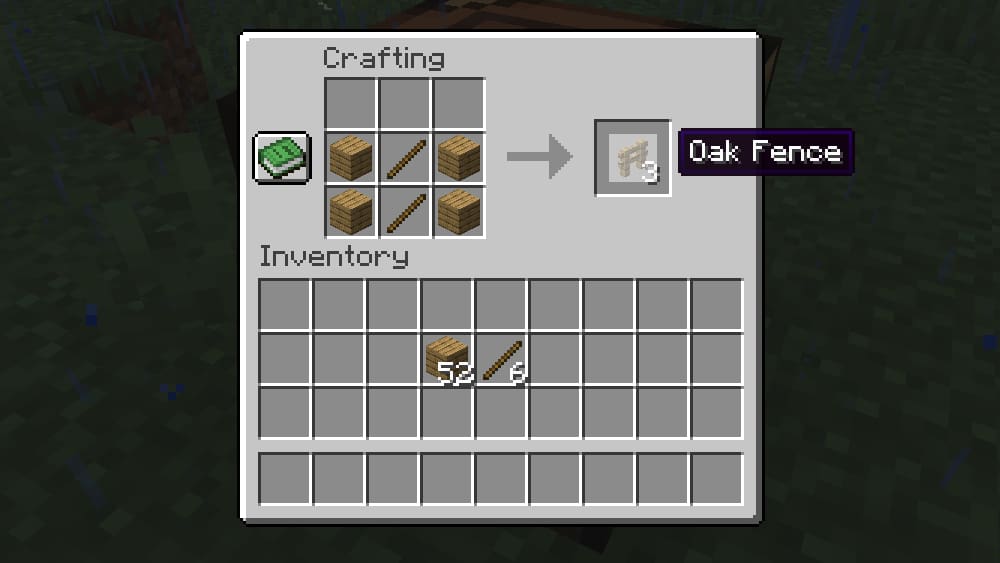 Avant de commencer à fabriquer des clôtures, assurez-vous d’avoir suffisamment d’accès au bois ! Vous aurez besoin d’au moins quatre planches de bois et de deux bâtons pour faire trois clôtures. Si vous avez besoin d’en faire plus, prenez plus de bois !