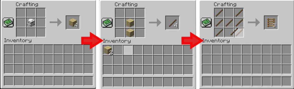 Tout ce dont vous avez besoin est un seul bloc de bois (n’importe quel type fera l’affaire). Oh, et une table de fabrication fonctionnelle, bien sûr. Apportez le bloc à la table et faites des planches avec. Utilisez maintenant deux planches, l’une au-dessus de l’autre, pour obtenir des bâtons. Enfin, utilisez 7 bâtons pour former un « H » pour obtenir vos échelles. Simple et rapide.