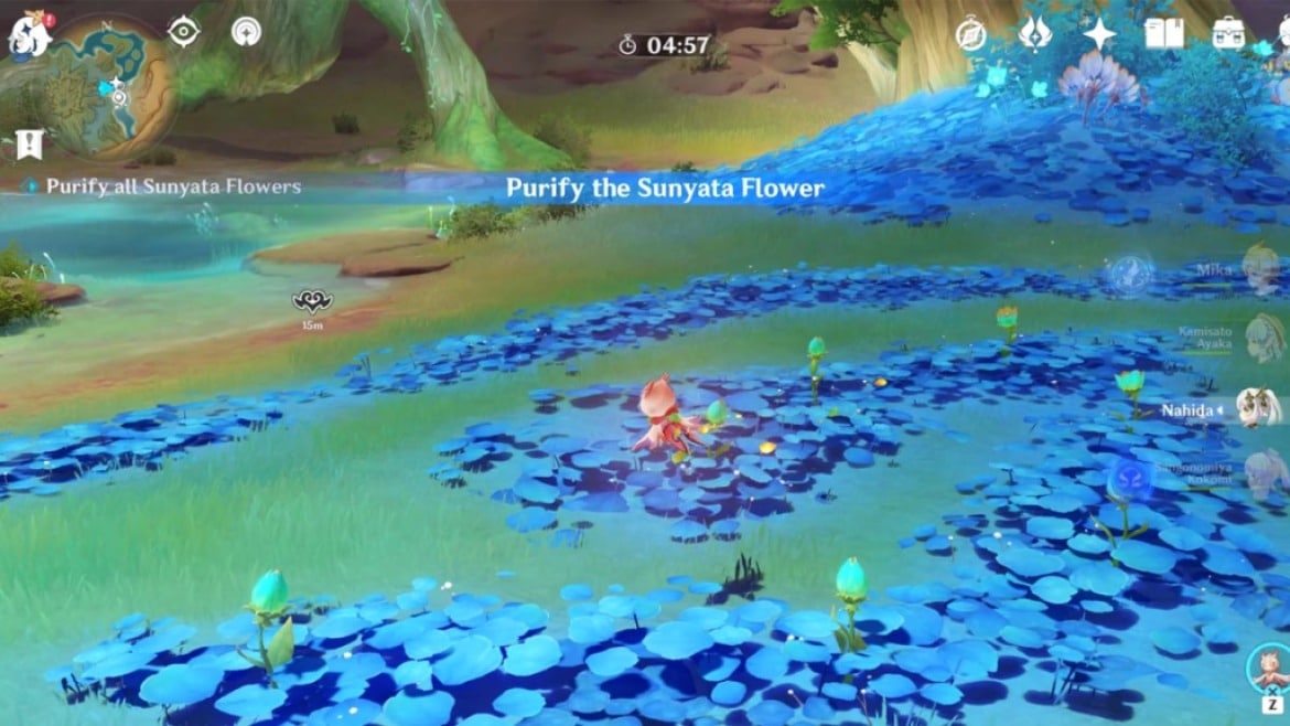 Entrez en mode Sorush et commencez à flotter à côté des fleurs pour lancer un défi de temps dans le but de « Purifier toutes les fleurs de Sunyata ». Passez à travers les fleurs en tant que Sorush pour les faire fleurir instantanément. En les épanouissant tous, de nouvelles fleurs apparaîtront dans les allées d’herbe à proximité. Répétez le même processus jusqu’à ce que toutes les fleurs soient épanouies. Inutile d’utiliser son habileté, il suffit de passer à travers les fleurs.