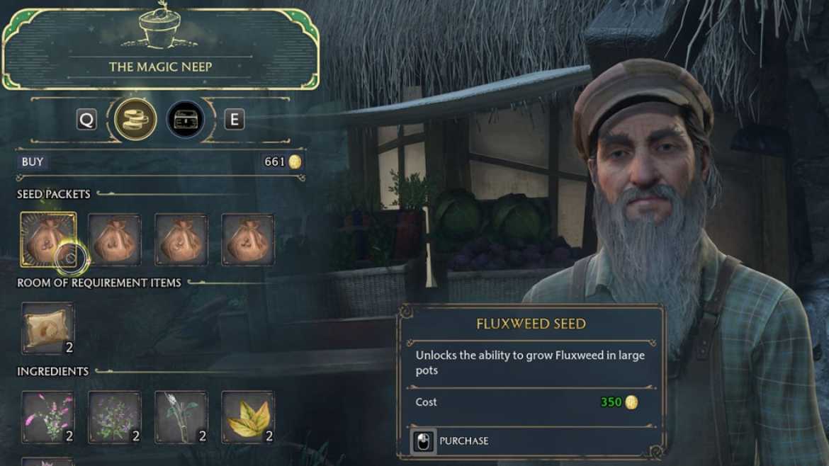 Les graines de Fluxweed sont parmi les rares qu’il vend dans sa boutique, aux côtés de Knotgrass, Mallowsweet et Shrivelfig. Les graines de Fluxweed coûtent 350 galions, ce qui les rend un peu chères si vous êtes encore en début de partie. Heureusement, une fois que vous aurez acheté les graines, vous n’aurez plus jamais à le faire et vous pourrez en cultiver autant que vous le souhaitez. Assurez-vous simplement d’avoir une station de plantes avec de grands pots à l’avance !