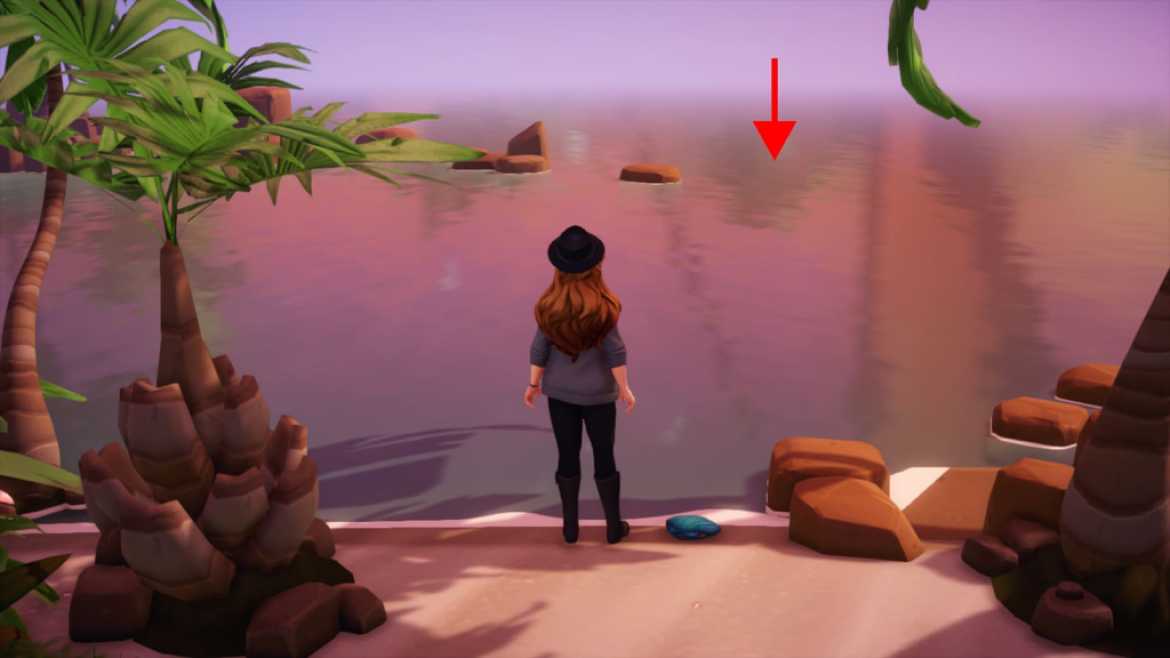 Avec votre pomme de terre bleue à la main, dirigez-vous vers le royaume de Moana et courez jusqu’à ce que vous voyiez un petit espace entre deux palmiers sur la côte. En regardant l’océan, vous apercevrez une collection de rochers près d’une île. Courez vers ces rochers avant de virer vers la droite, légèrement vers l’emplacement de l’image ci-dessous.