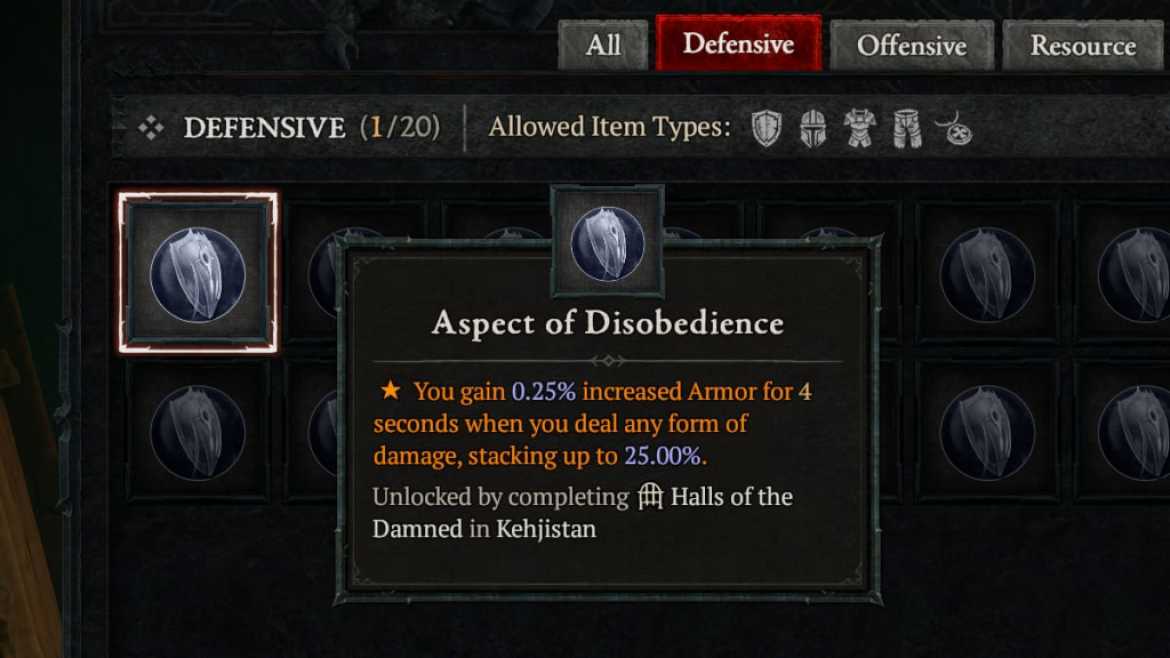 Pour obtenir l’aspect de désobéissance, vous devrez effacer le Salles du donjon des damnés dans l’est Kehjistan. Après avoir terminé ses objectifs et vaincu le boss du donjon, vous recevrez automatiquement l’Aspect dans votre Codex du Pouvoir.