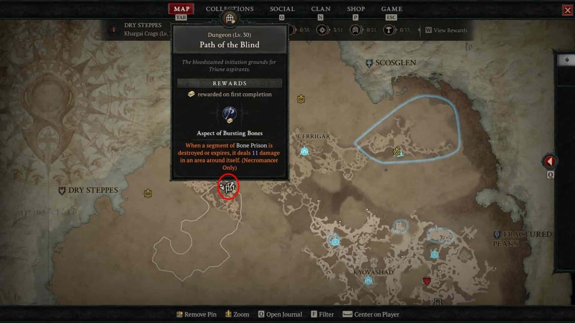 Pour obtenir l’aspect des os éclatants dans Diablo 4, vous devez vous diriger vers le chemin des donjons aveugles trouvés dans les steppes sèches. Consultez la carte ci-dessous montrant son emplacement. Ici, vous obtiendrez l’Aspect of Bursting Bones pour l’avoir terminé.