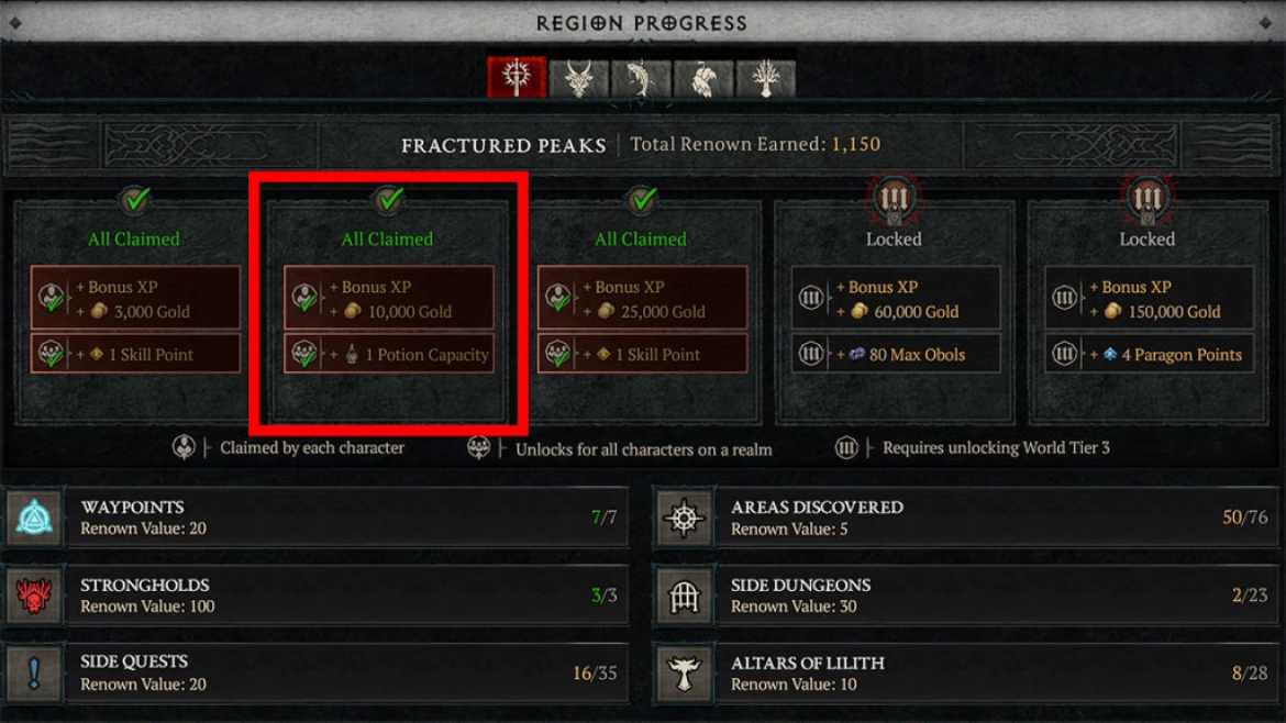 La seule façon d’augmenter votre limite de potions dans Diablo 4 est de progresser dans les Système renommé. Vous gagnerez Points de renommée et déverrouiller récompenses à plusieurs niveaux en découvrant des waypoints, en déverrouillant des forteresses et en trouvant de nouvelles zones. À niveau deuxvous gagnerez un emplacement de potion supplémentaire pour tous vos personnages! Vous pouvez le faire jusqu’à cinq foisune fois par région.
