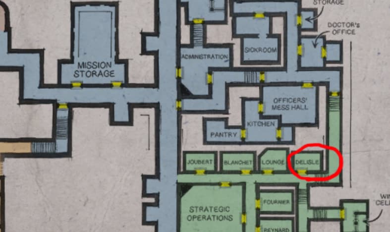 Vous apprendrez alors que la nouvelle roue appartient à un casier d’un soldat appelé Delisle. Rappelez-vous ce nom, allez dans sa chambre (voir la carte ci-dessus) et prenez son Dog Tag. Vous pouvez accéder à sa chambre soit en cassant la porte, soit en ouvrant la porte adjacente et en trouvant un autre évent sur le mur de la chambre de Delisle. Dans la capture d’écran ci-dessous, vous pouvez voir où la roue de verrouillage a été cachée dans ma partie.