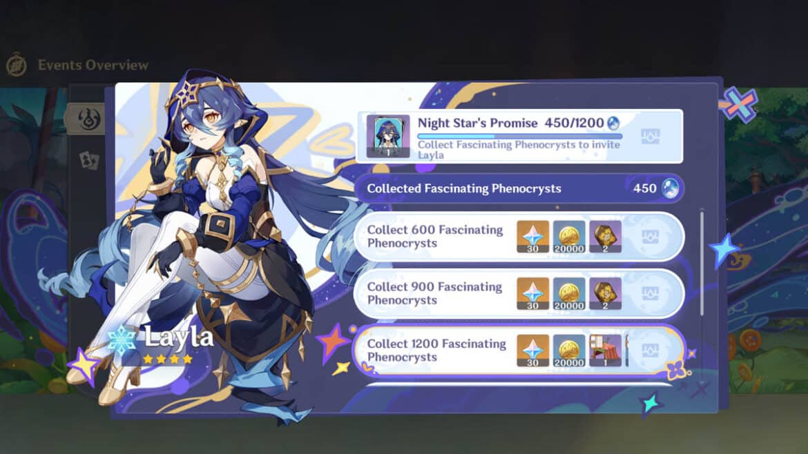 En vous dirigeant vers l’onglet Événement et en sélectionnant Promesse de l’étoile de la nuitvous pouvez réclamer votre Layla gratuite une fois que vous avez obtenu 1200 phénocristaux fascinants. Ceci est réalisable une fois que le troisième lot d’attractions est déverrouillé (AKA lorsque l’histoire principale est terminée), donc pas besoin de les précipiter tous en même temps. Il faut encore un certain temps pour obtenir votre personnage gratuit.