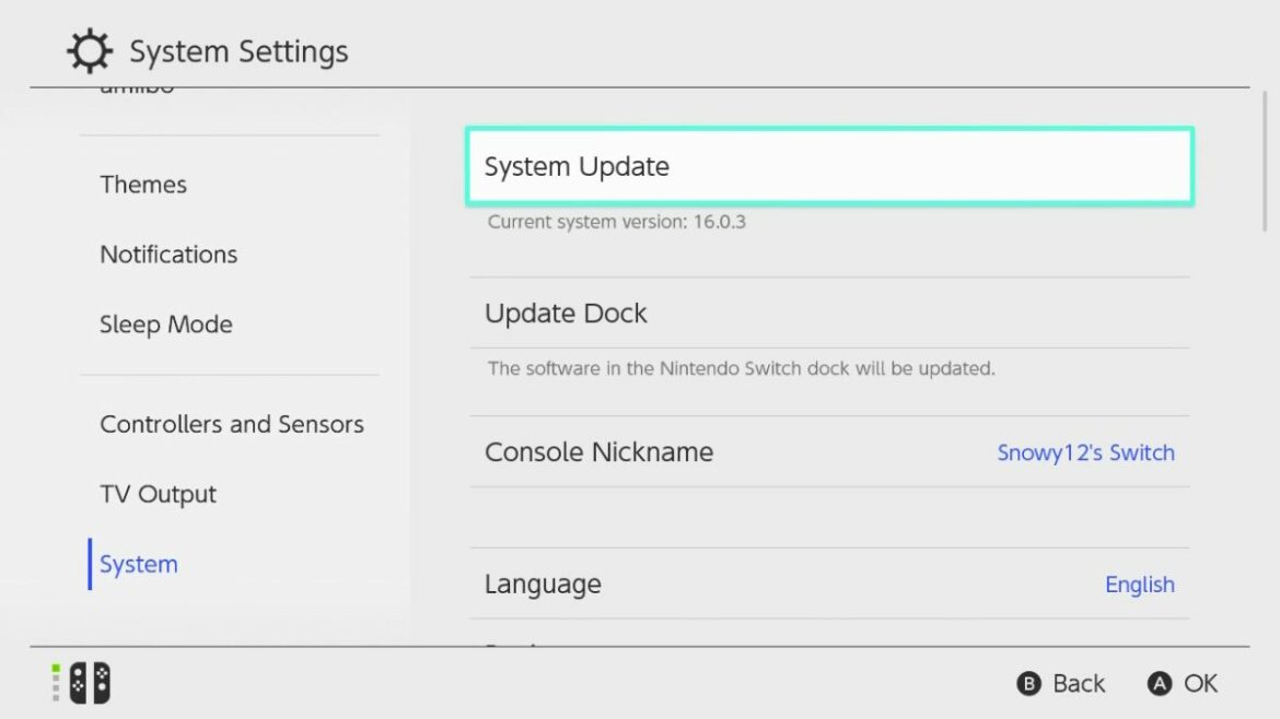 Avant de commencer votre étalonnage, vous devez assurez-vous que votre console et vos manettes Nintendo sont à jour avec la dernière version du logiciel. Pour vérifier et exécuter une mise à jour, accédez à Paramètres système. Faites défiler vers le bas de la liste de sélection et cliquez sur Système.