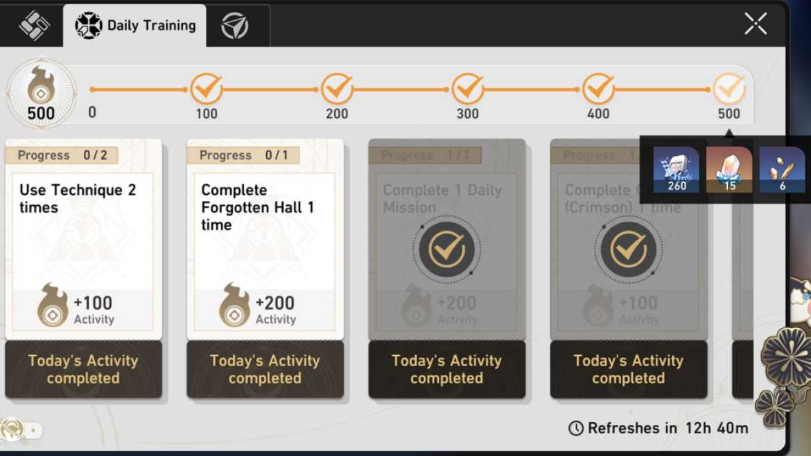 Le journal d’activité habituel que vous recevez tous les jours. C’est la meilleure méthode pour un nivellement facile puisque l’obtention de 500 points d’activité vous donne 1300 Trailblaze Experience. Les activités vont de choses simples comme terminer une mission quotidienne à nettoyer des calices, ou parfois même simplement prendre des photos ! Ils ne vous prendront généralement pas plus de 5 minutes, alors effacez-les dès que vous vous connectez au jeu.