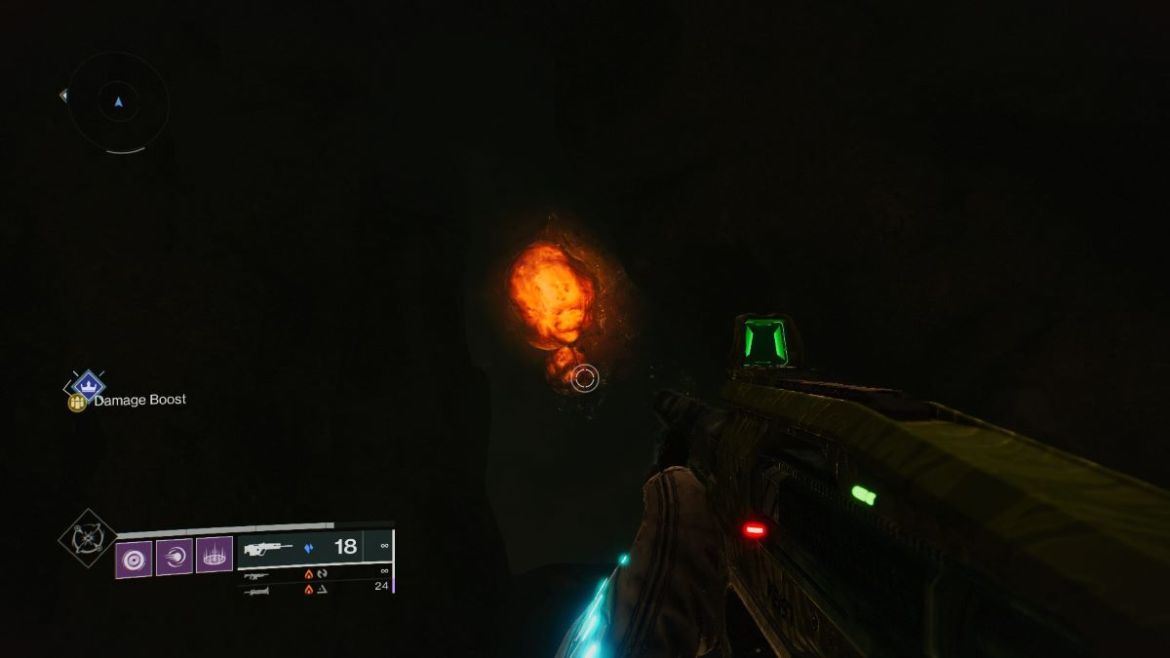 Vous arriverez dans une plus grande chambre, avec quelques Scorns à barre orange. Tuez les Scorns, puis allez dans la pièce en forme d’os à côté d’eux. A l’intérieur, vous verrez l’orbe de vision profonde blanc et lumineux. Interagissez avec lui, et vous pourrez presque commencez la quête.