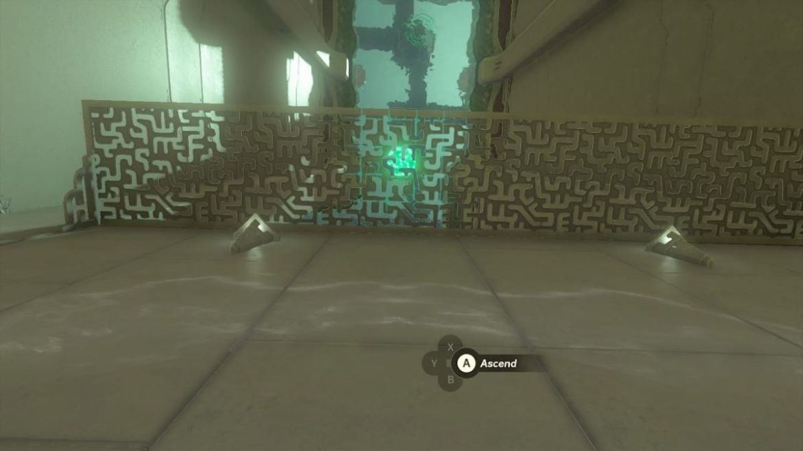 C’est ici que commence le vrai casse-tête. Et c’est assez facile. Il y a une grille métallique sur le sol à laquelle est attaché un appareil Zonai vert. Cet appareil Zonai soulève tout ce à quoi il est attaché et tient en équilibre sur sa base en cuivre.
