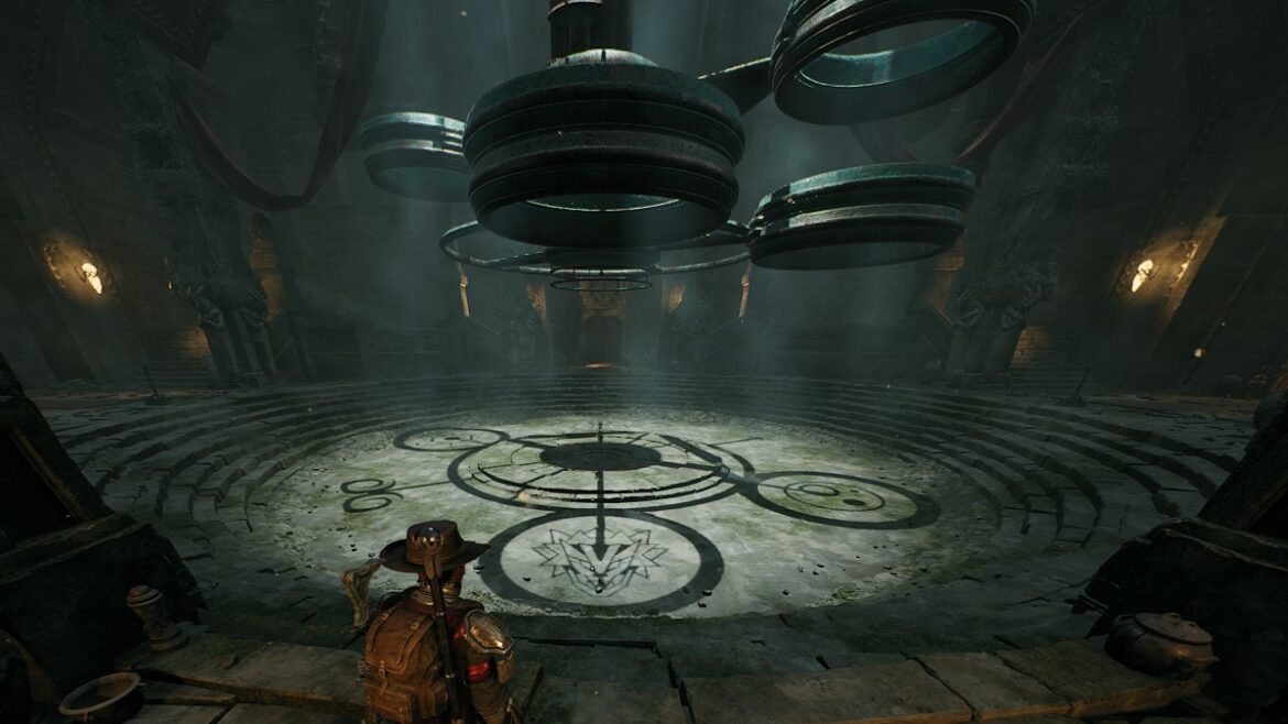 Lorsque vous entrez pour la première fois dans la cathédrale d’Omens, vous rencontrerez des gros disques métalliques dans le ciel, des symboles au sol et plusieurs portes devant vous. La porte de gauche est déjà ouverte en claquant, pourtant les deux autres portes sont fermées. Ces portes ont aussi quelques triangles étranges sur eux, ajoutant à la confusion. Tout d’abord, dirigez-vous vers le côté droit de la pièce, puis montez les escaliers pointant vers l’endroit où vous êtes venu.