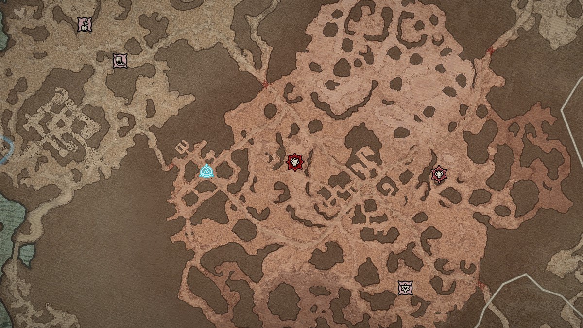 L’Abomination bouillonnante peut être trouvée à son événementsitué dans l’une des zones PvP (indiquées par leur sable rouge.) Dans l’une ou l’autre de ces zones, vous pouvez trouver un marqueur qui est rouge vif avec un crâne de démon dessus. Vous pouvez utiliser notre image ci-dessus pour référence. Dirigez-vous vers l’emplacement qui est marqué, tandis que éviter les autres joueurs si le PvP est activé, et vous trouverez l’Abomination bouillonnante qui rôde. Attaquez-le pour commencer le combat.