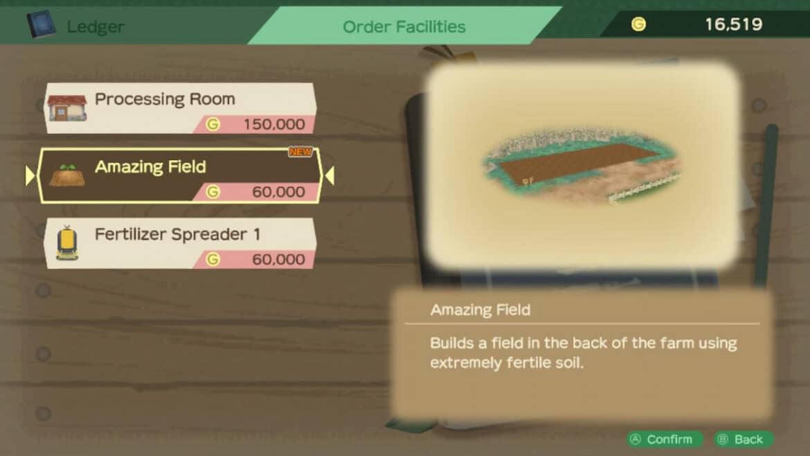 Une fois que Takakura vous a mentionné le troisième champ, vous pouvez l’acheter dans le Ledger pour 60 000G. Cela en vaut la peine car cela vous offre plus d’espace pour cultiver les cultures de votre choix. De plus, c’est le plus fertile de tous les champs, et les cultures hybrides rares nécessitent la qualité du sol pour être plantées.