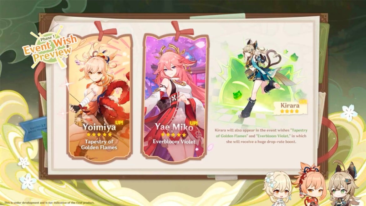 Inazuma fait son retour avec Yoimiya et Yae Miko sont les personnages vedettes de la première moitié de la 3.7. Les deux filles et leurs armes de prédilection sont présentes, ainsi que Kirara, qui est présentée en tant que 4 étoiles durant cette première bannière.