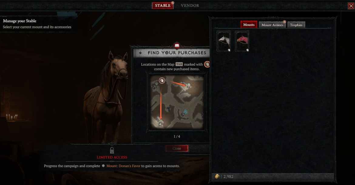 Parlez au maître d’écurie pour déverrouiller votre cheval et votre armure de cheval. Cependant, vous n’aurez pas accès à la monture et ne pourrez pas l’utiliser tant que vous n’aurez pas terminé la quête » dans l’acte 3. Retournez voir n’importe quel maître d’écurie après avoir terminé la quête pour utiliser votre monture.