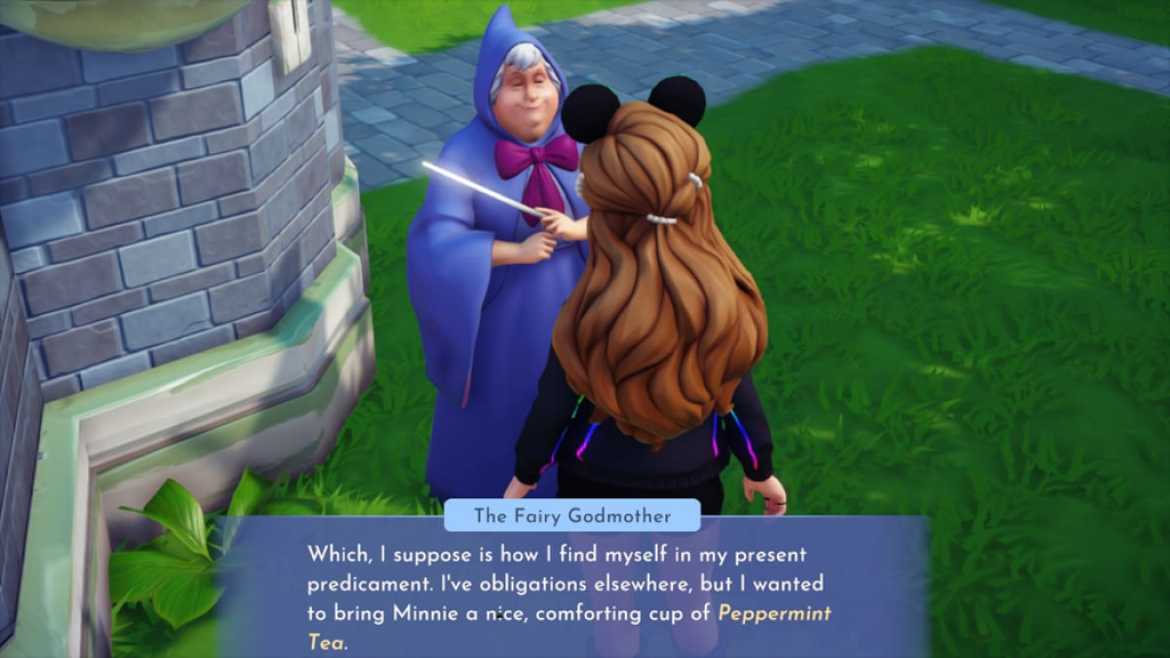 Pour commencer la quête, vous devrez porter le niveau d’amitié de la fée marraine à sept. Une fois que vous avez fait cela et que vous lui avez parlé, elle vous dira qu’elle est dépassée en essayant d’aider tout le monde dans le village, vous incitant à donner un coup de main. Elle vous demandera si vous pouvez en préparer thé à la menthe poivrée pour Minnie, auquel vous accepterez l’offre et aiderez.
