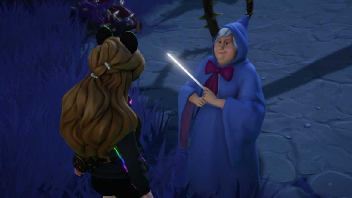 Pour commencer cette quête, recherchez le fée marraine et lui parler. Je la vois souvent dans sa maison de citrouille Forgotten Lands, mais elle se promène parfois pour discuter avec d’autres villageois. Parlez-lui pour commencer la quête, vous invitant à écouter sa conversation avec Merlin.