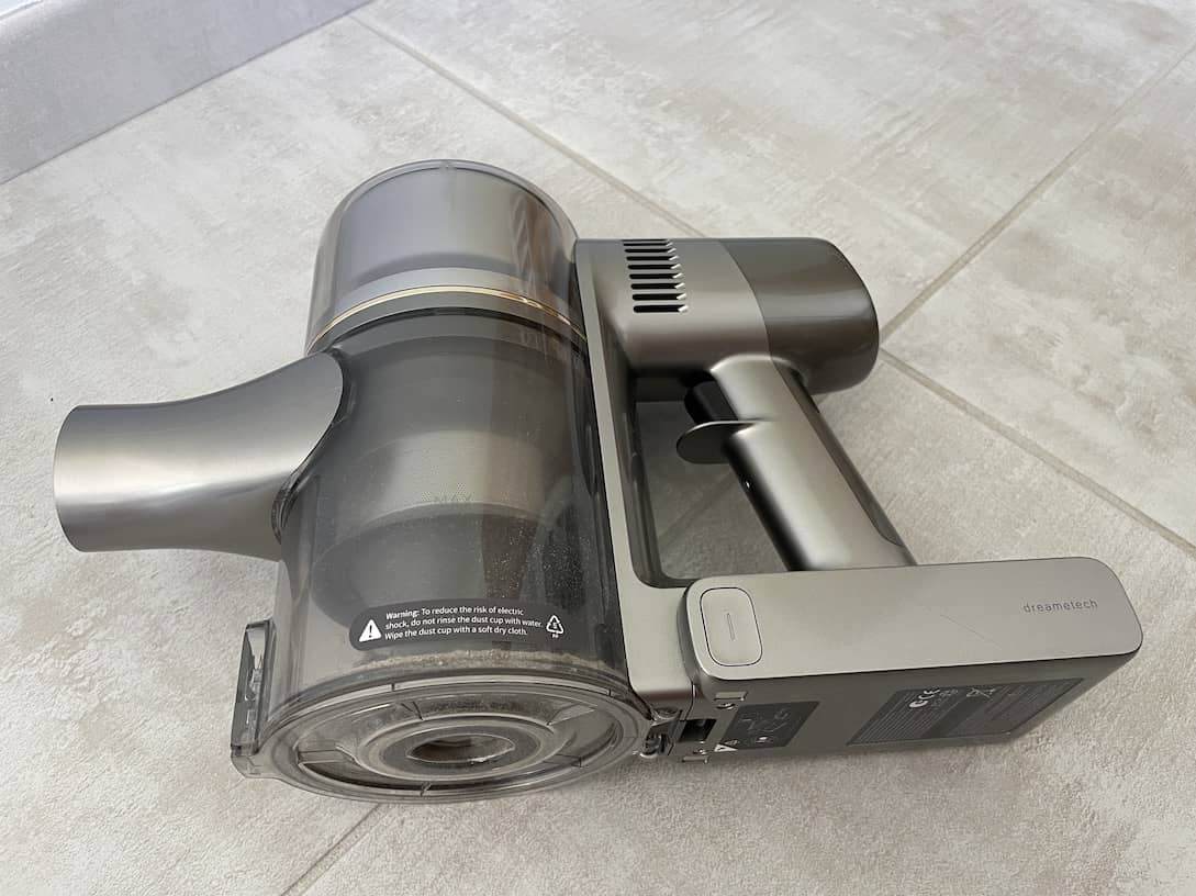 Sinon, ne suis que modérément satisfait du système de vidange. Il suffit d’appuyer sur un bouton pour qu’un clapet s’ouvre vers le bas, avec suffisamment d’élan pour que la poussière jaillisse littéralement. Veillez donc à ne pas tenir le bac à poussière du Dreame R20 trop haut au-dessus de la poubelle, gardez-le aussi bas que possible ou même légèrement à l’intérieur de la poubelle. En revanche, il est facile à démonter et à nettoyer. Le fabricant recommande de laver le pré-filtre tous les trois mois et l’ensemble du système tous les six mois.