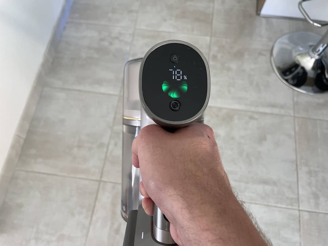 Le nouveau Dreame R20 est agréablement silencieux en mode standard. Même au niveau d’aspiration le plus élevé, le bruit n’est pas gênant. De plus, j’ai constaté que je n’avais besoin de basculer en puissance maximale uniquement lorsque je nettoie mes tapis. L’écran quelque peu surdimensionné affiche graphiquement la puissance d’aspiration.
