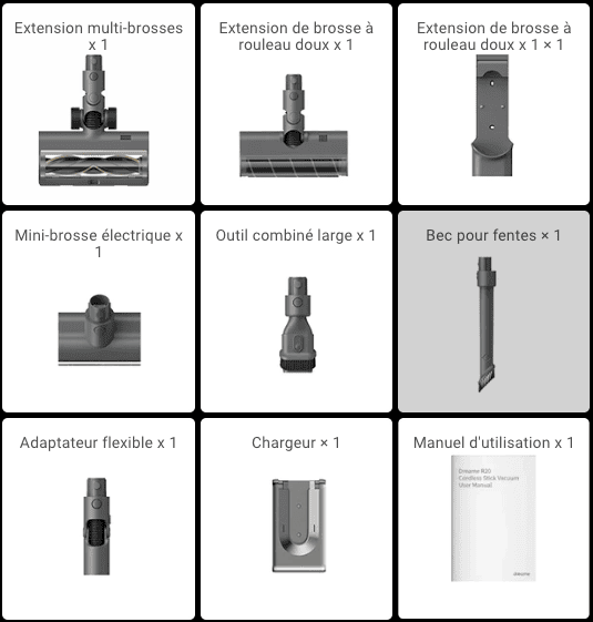 | Accessoires | 3 brosses principales, 1 brosse 2-en-1, un suceur flexible |