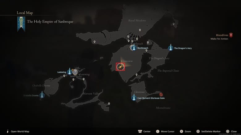 En arrivant à Sanbreque, sélectionnez l’obélisque Northreach au milieu de la carte. L’Ange de la Mort est situé à Claireview, dans le Sud-Est. Vous le verrez voler dans les champs, loin de la forêt comme le prétendait le Hunt Board.