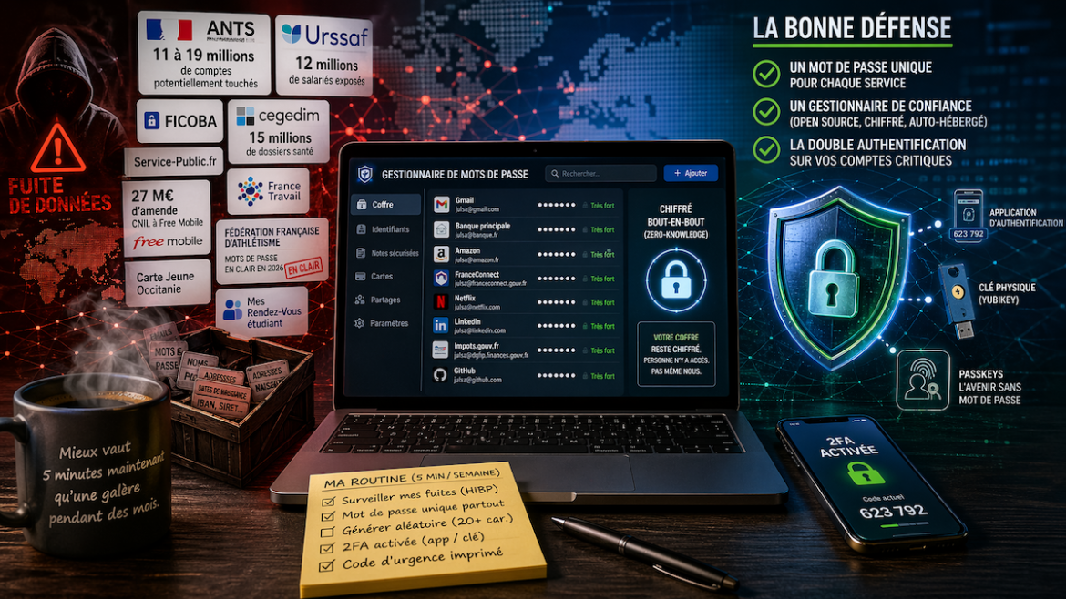 Je regardais cette semaine les derniers bulletins de Cybermalveillance.gouv.fr en buvant mon café, et j’avoue que j’ai eu un petit vertige. En quelques mois, on a enchaîné la fuite ANTS (entre 11 et 19 millions de comptes potentiellement touchés selon les sources), les 12 millions de salariés exposés par l’incident URSSAF, le piratage du fichier FICOBA, Cegedim et ses 15 millions de dossiers santé, Service-public.fr, France Travail, les 27 millions d’euros d’amende infligés par la CNIL à Free Mobile, et une trentaine de fédérations sportives dont la fédération française d’athlétisme qui, en 2026, stockait encore des mots de passe en clair dans sa base. Même la Carte Jeune Occitanie et Mes Rendez-Vous côté étudiant y sont passés.