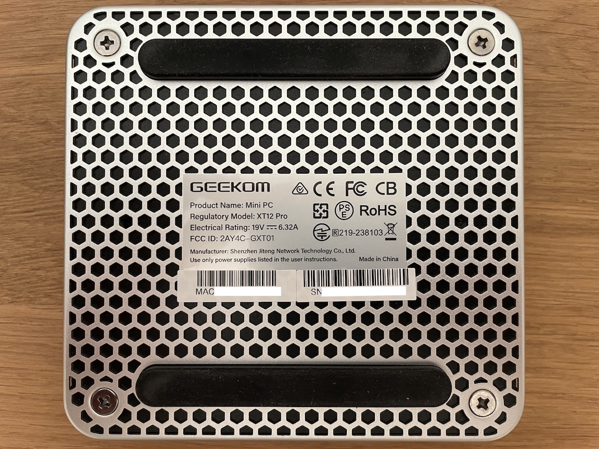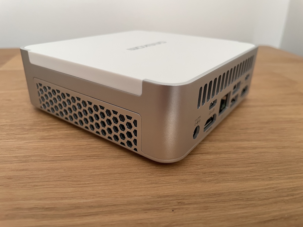 Le Mini PC est principalement en aluminium argenté avec un dessus en plastique blanc, peu sensible aux empreintes. Contrairement aux apparences, les perforations sous le XT12 Pro ne servent pas à la ventilation, mais sont purement esthétiques.