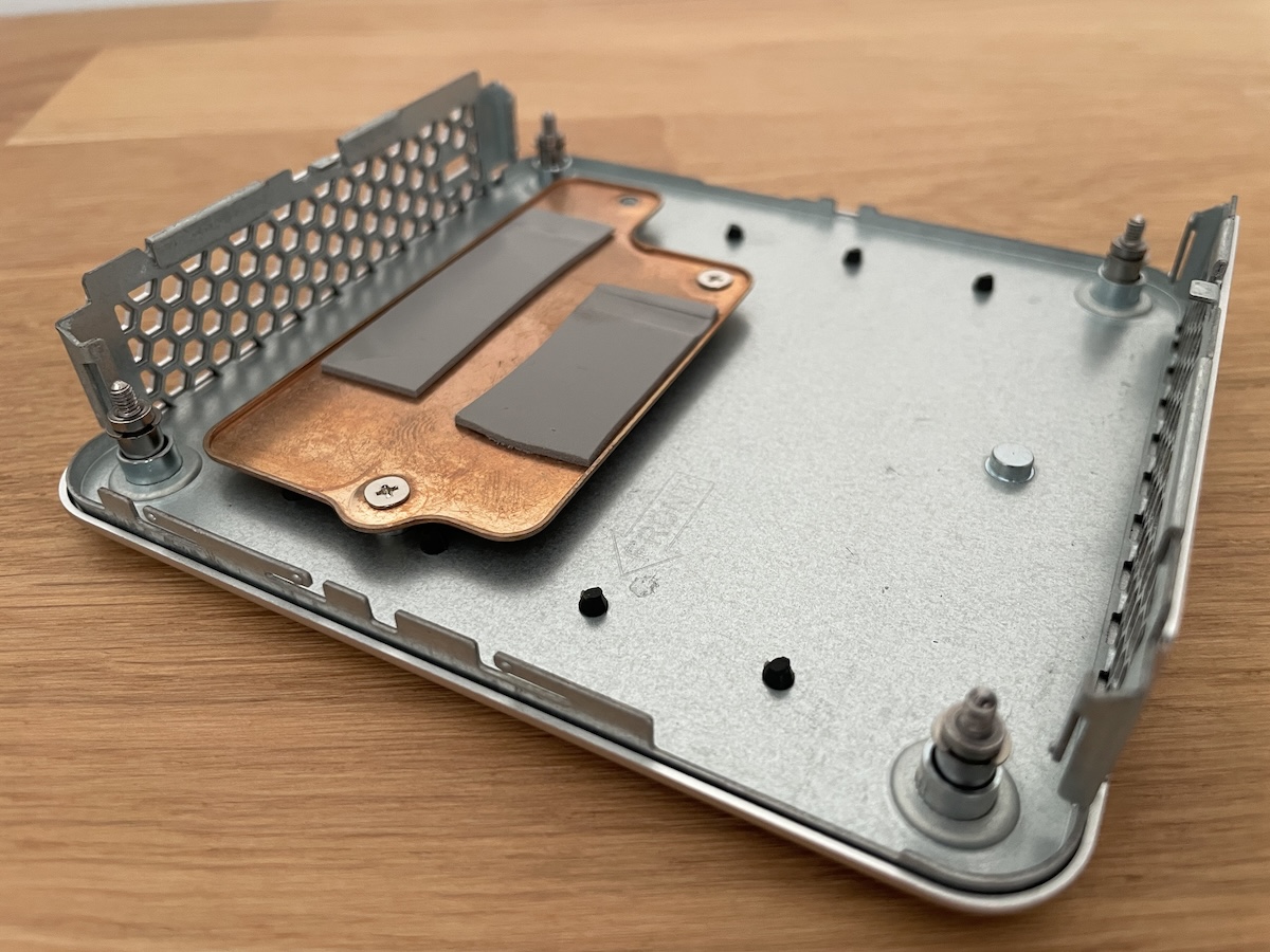 L’accès à l’intérieur du Mini PC est simple : il suffit de dévisser les quatre vis cruciformes à la base. Ces vis restent fixées à la plaque pour éviter de les perdre. Une fois ouverte, la base se sépare complètement du reste sans câbles fragiles à manipuler.