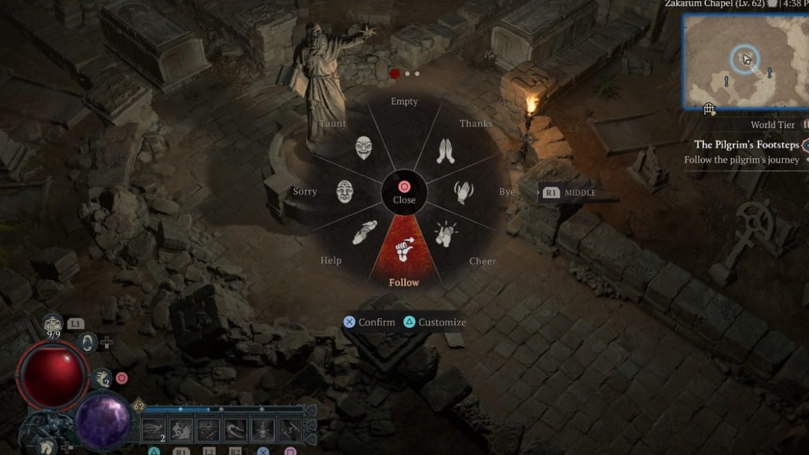 Montez jusqu’à la statue du pèlerin et ouvrez la roue des emotes. Vous devez utiliser l’emote « Suivre » pour activer la solution à la quête. Dès que vous emotez, la tâche est terminée et un coffre plein de butin apparaîtra sur le côté droit de la statue. La quête Pilgrim’s Path est vraiment facile à compléter, et de nombreuses autres quêtes secondaires dans Diablo 4 suivront le même format.