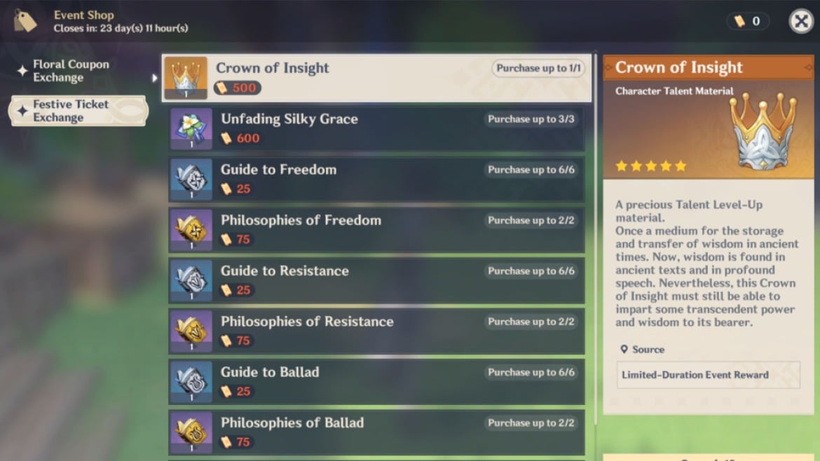 En parlant de cela, vous trouverez ici de nombreuses ressources précieuses. En plus de l’Unfading Silky Grace requis pour Mailed Flower, vous obtenez également mobilier exclusif, Weapon Enhancement Materials, Mora, a Crown of Insight et Mondstadt Talent Books. Nous n’avons peut-être pas de Mondstadter dans les bannières limitées (c’est-à-dire si vous ne prévoyez pas d’obtenir Mika plus tard), mais celles-ci pourraient être bonnes si Eula la rediffusait un jour. Relâchez la fille, Hoyoverse, s’il vous plaît !