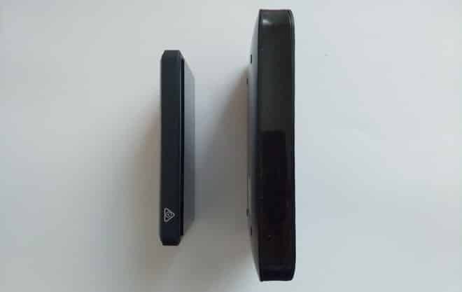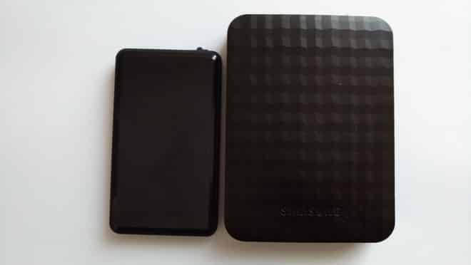 Pour réaliser ce test, j’ai pour ma part utilisé la version 256 GB, qui, une fois branché sur mon pc s’est révélée être de 230GB (Une petite perte que l’on retrouve sur tous les disques dur). Ce qui m’a le plus marqué lors du déballage du SSD est sa petite taille et donc sa portabilité. En effet, vous pouvez constater, photos à l’appui, la différence non négligeable entre mon disque dur externe 2,5″ Samsung et le petit SSD d’Emtec. De plus, son matériau de base, sa légèreté et le contour en gomme semblent assurer la solidité de l’objet, il peut donc facilement être transporté dans une poche sans être trop encombrant et sans risque de l’endommager. Son cable en revanche est un peu petit mais semble solide et surtout, ne se débranche pas tout seul, même avec le disque dur en suspens.