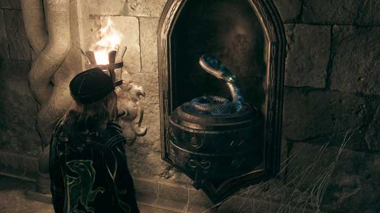 Après avoir allumé les trois braseros, déverrouillez la première entrée et entrez dans le passage souterrain, Vous apercevrez des portes verrouillées et des statues de serpents. Vous verrez également des symboles sur les deux, avec lesquels vous pouvez interagir sur ce dernier pour progresser dans chaque puzzle. Chaque statue de serpent a une torche à côté, que tu devras allumer avec Confringo ou Incendio pour l’activer.