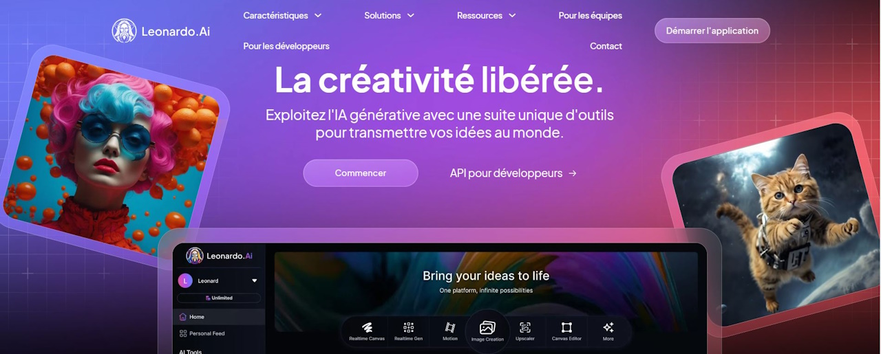 Leonardo AI s’appuie sur une intelligence artificielle de pointe pour permettre aux utilisateurs de générer des œuvres d’art, des images et des vidéos de haute qualité. Il exploite la puissance d’algorithmes avancés, simplifiant et améliorant ainsi le processus créatif. Plus précisément, la plateforme d’IA propose trois fonctionnalités :
