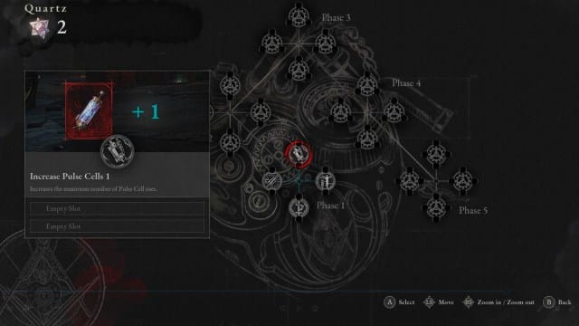 Il y a initialement cinq phases pour l’orgue P, avec une sixième phase débloquée dans un nouveau jeu + après avoir battu le jeu. Il y a quatre améliorations principales dans chaque phase, chacune d’entre elles nécessitant d’abord l’activation des effets de machine à sous, qui sont également de grandes améliorations qui changent la donne. Chaque emplacement peut être activé avec un quartz, qui est obtenu en battant des boss et trouvé dans les coffres autour du jeu.